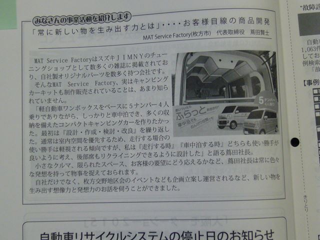 大阪府自動車整備振興会発行の『まいど!』1月号に キャンピングキット『FALT・ふらっと』を取り上げて頂きました。一般紙ではありませんが、自動車関係の会社などでは見て頂けるものです。目に付いた時は、ぱらっと一読ください。宜しくお願いします。