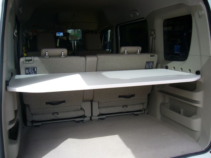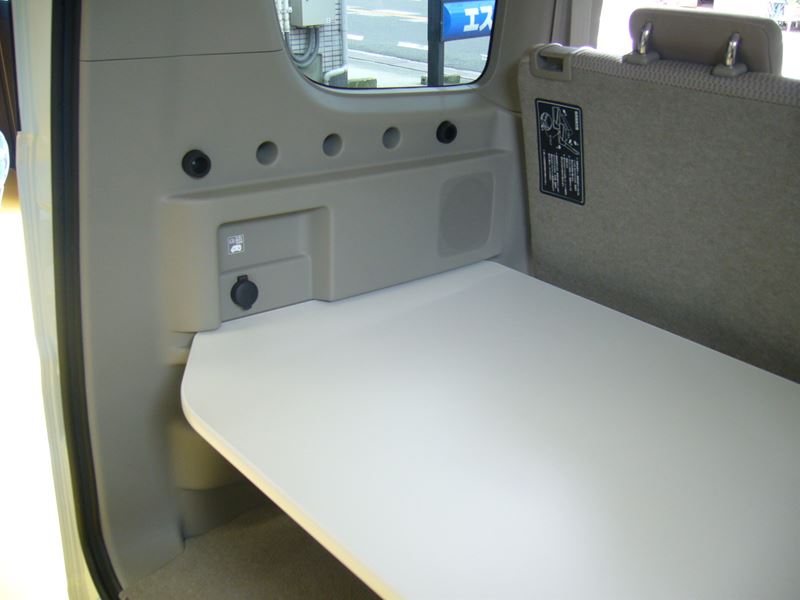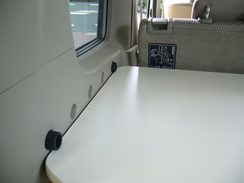 テーブルがあれば工夫がいっぱい! 荷物を載せたり、さっと拭いてゲージを載せたり・・・使い方満載。 ●車両に標準装備の溝(上下2箇所・上部には専用アタッチメントを取り付ける)に差し込み取り付け可能。表面材質:メラミン、最大耐荷重:10Kg